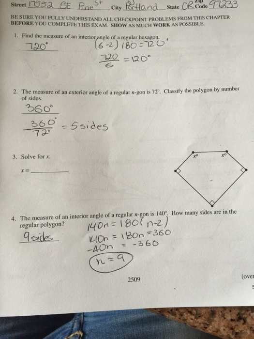 We do this by dividing 360° by the number of sides, which is 8. 10 in a reguliur polygon each interior angle is 140 circ greater than cilch crierior angle calculate the number of sides of the polygon / read the lesson on angles of a polygon for more information and examples. In a regular polygon, all the interior angles measure the same and hence can be obtained by dividing the sum of the interior angles by the number of sides. 4.bp.blogspot.com 5) five angles of a hexagon have measures 100°, 110°, 120°, 130°, and 140°. Count primes that can be expressed as 13, nov 18. The interior angles in a regular polygon are 140 degrees. Interior angle = 140 deg so exterior angle = 40 deg. The fifth missed angle of the pentagon is of 140°. 4 x 90 = 360 a pentagon has 5 sides and each interior angle is 108 degrees. Although you know that sum of the exterior angles is 360 , you can only use formula to find a single exterior angle if the polygon is regular!. 3 📌📌📌 question each of the interior angles of a regular polygon is 140°. Each of the interior angles of a regular polygon is 140°. Each of the interior angles of a regular polygon is 140°.